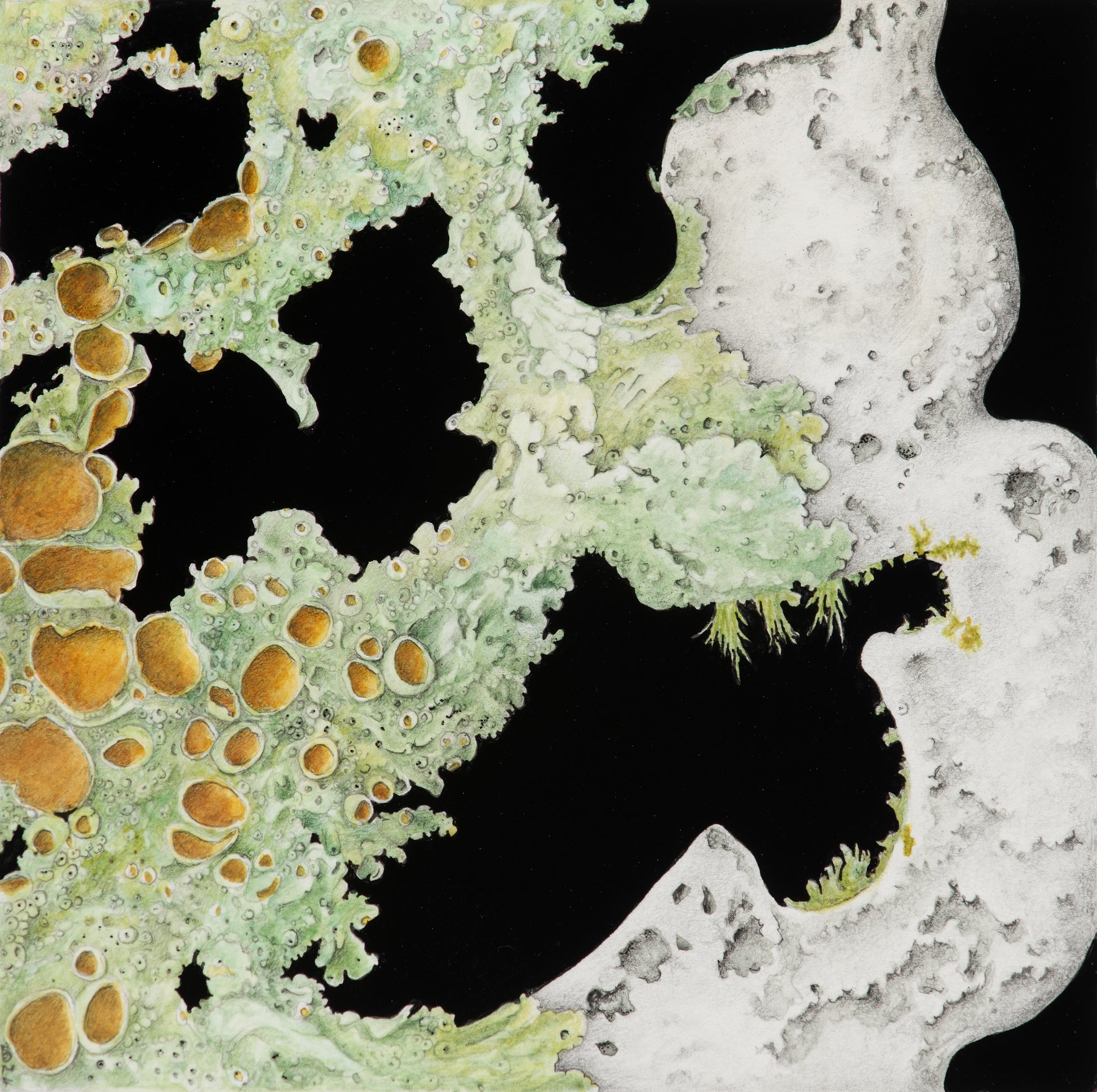 Curled lace from the forest’s weathered soul 1, watercolour, graphite and gouache, 10cm x 10cm (image), 27cm x 27cm (framed) in black timber with off-white mat, 2025