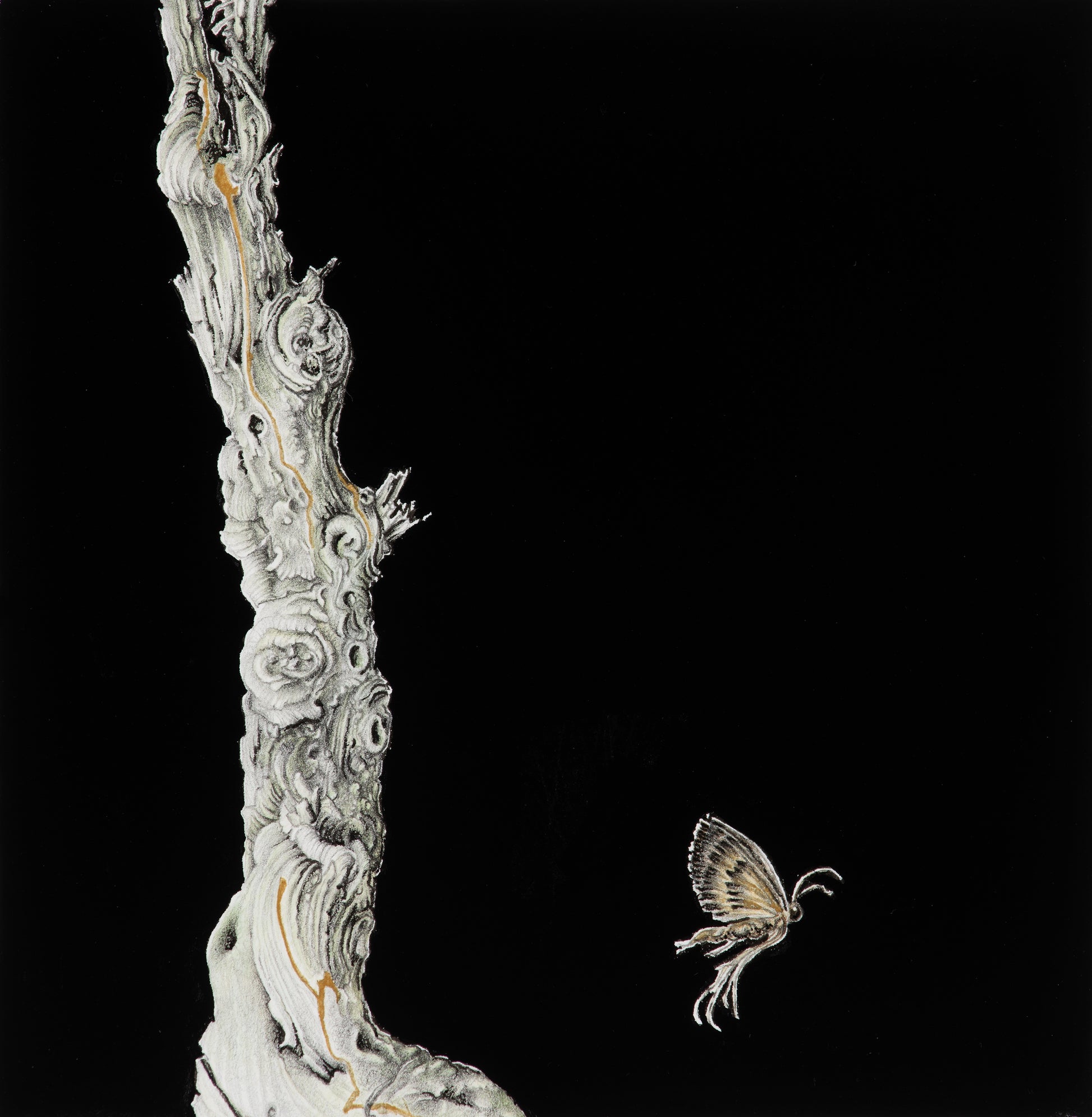 Enchanted spirals from a whispering tree 1, watercolour, graphite and gouache, 10cm x 10cm (image), 27cm x 27cm (framed) in black timber with off-white mat, 2025