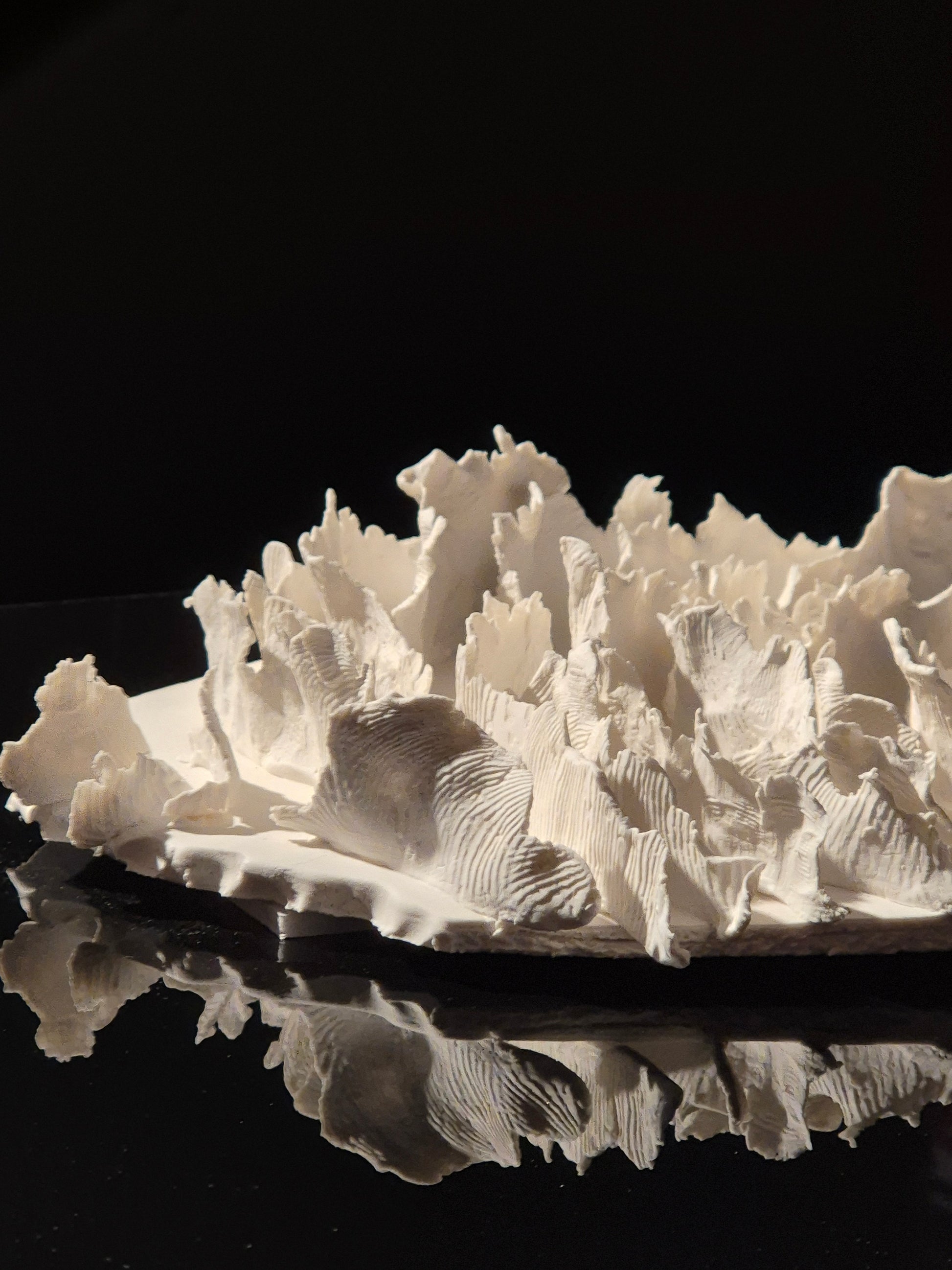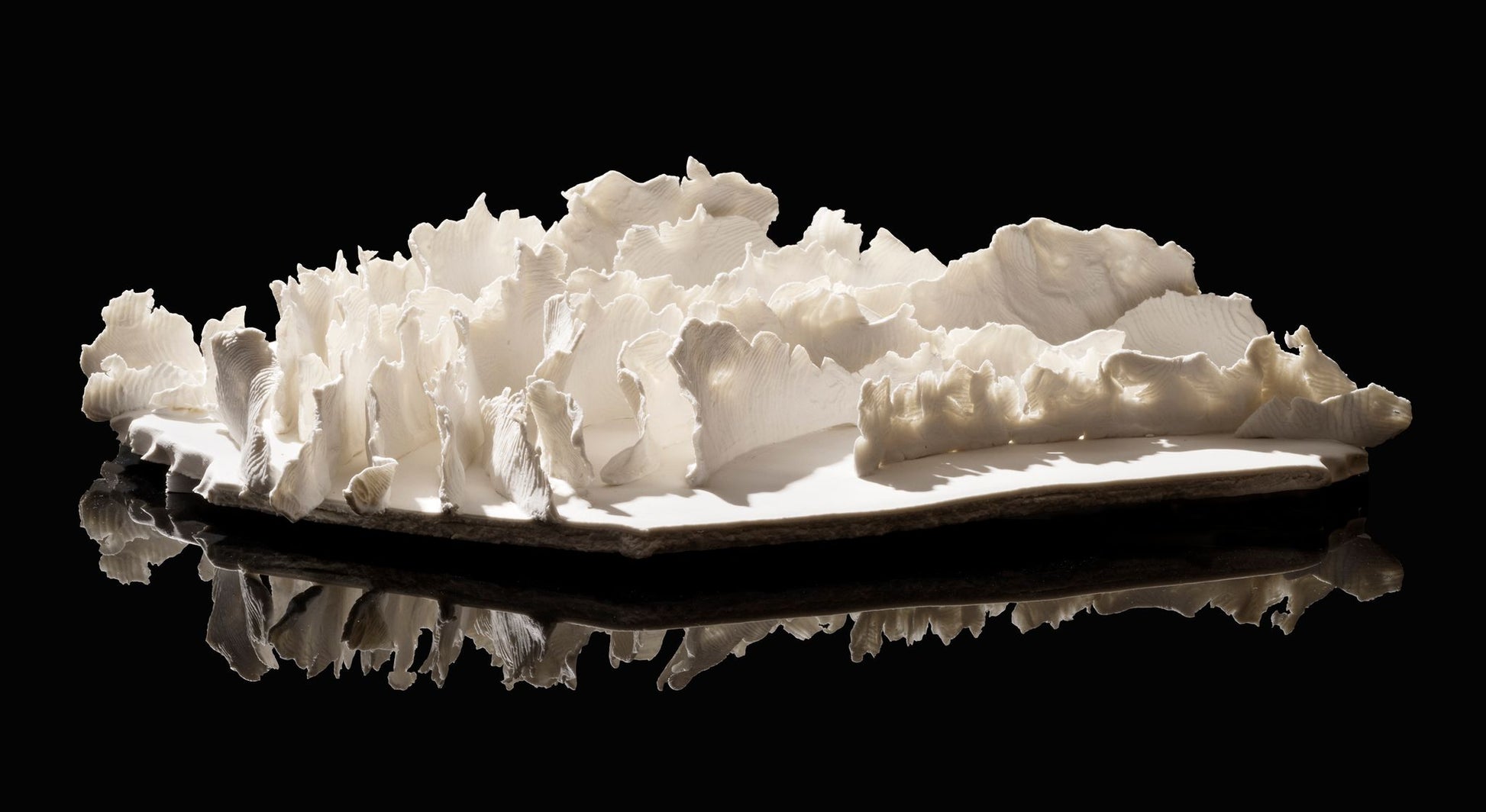 This powerful cycle of collapse and renewal sits precariously in the context of development pressures and climate change, underscoring the delicate balance of coastal ecosystems. Jo’s translucent porcelain cliffs trace the lines of these fleeting forces — waterway trajectories, shifting sands, and their inevitable collapse. Her delicate porcelain wafers, gently suspended above grounded landscapes, evoke both endurance and fragility, etched in time by ecological systems in constant flux.