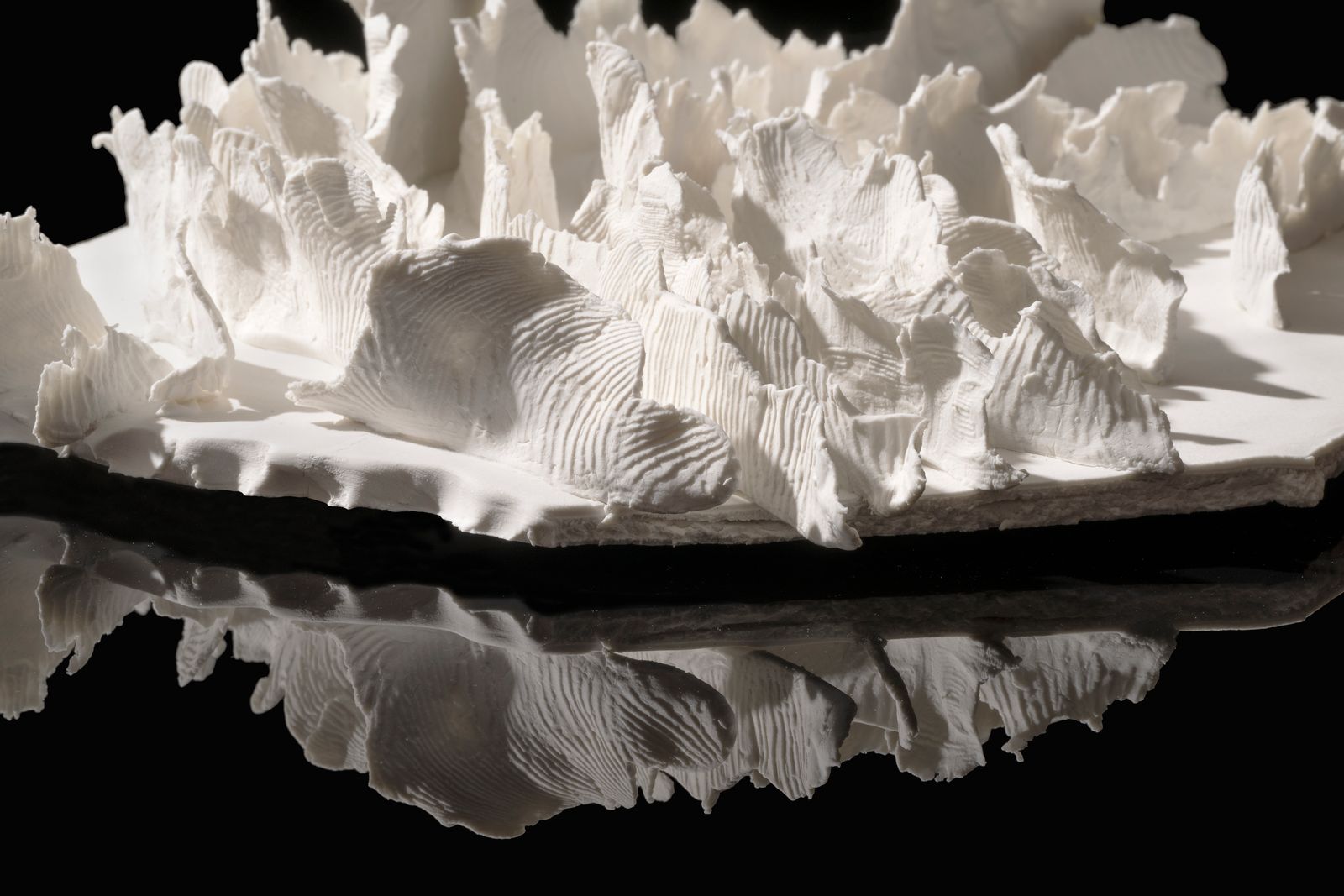 This powerful cycle of collapse and renewal sits precariously in the context of development pressures and climate change, underscoring the delicate balance of coastal ecosystems. Jo’s translucent porcelain cliffs trace the lines of these fleeting forces — waterway trajectories, shifting sands, and their inevitable collapse. Her delicate porcelain wafers, gently suspended above grounded landscapes, evoke both endurance and fragility, etched in time by ecological systems in constant flux.