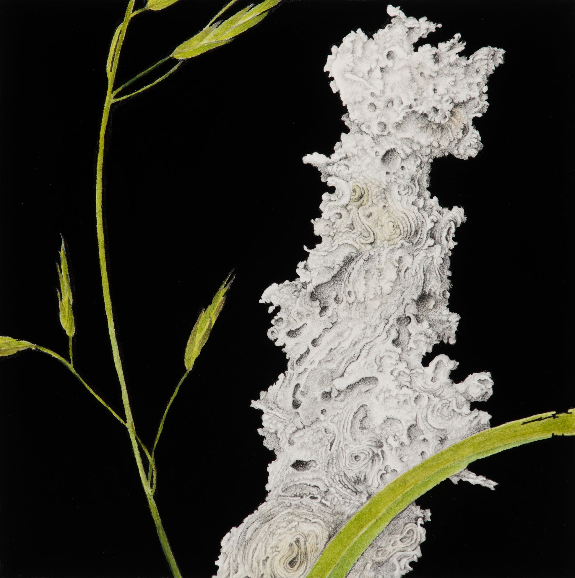 Nature’s calligraphy in spirals of sinewed life 1, watercolour, graphite and gouache, 10cm x 10cm (image), 27cm x 27cm (framed) in black timber with off-white mat, 2025