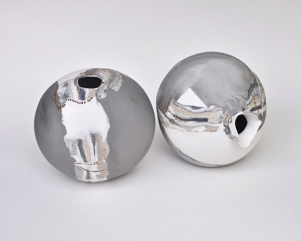 Left: Terra 2, porcelain, ceramic stain, stoneware, copper lustre, 14.2 cm diameter. Was $380 now $304.