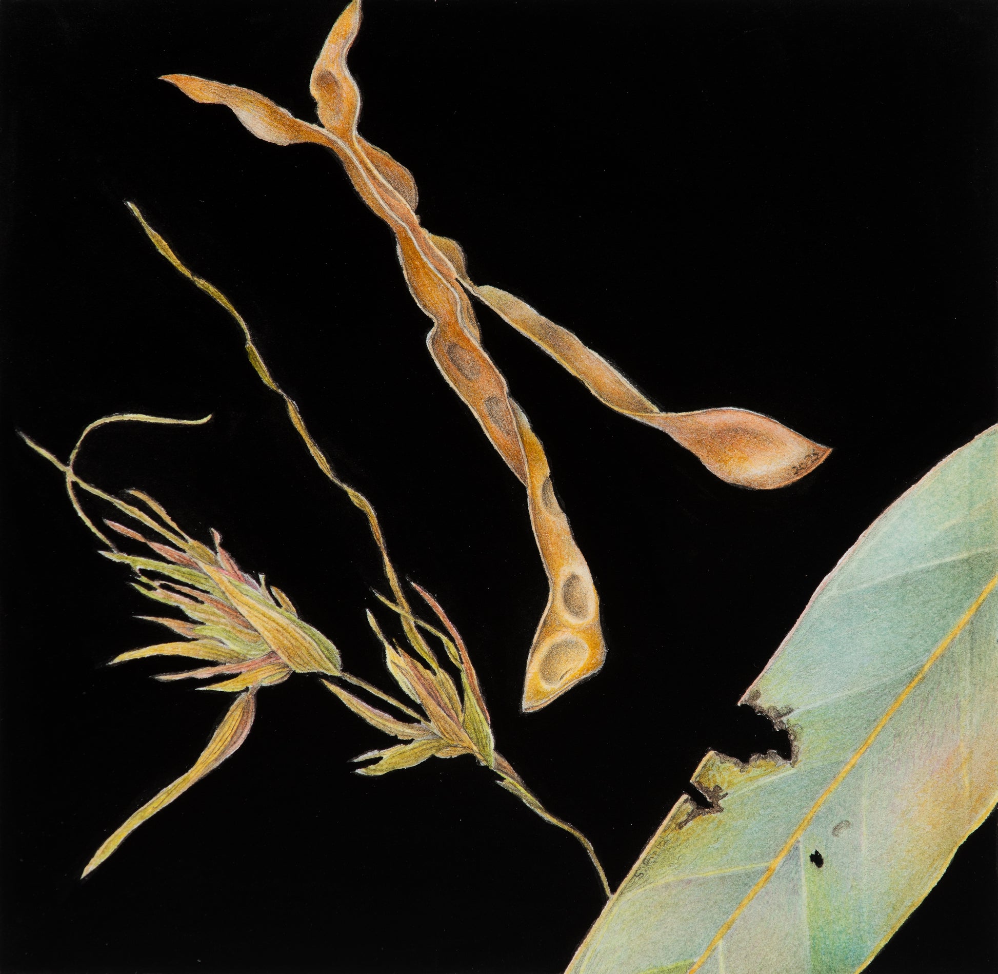 If you know how to read it, the bush is book of life with artefacts representing stories typical of summer in the Australian bush: the dried out husk from an acacia pod; a stalk of kangaroo grass (Themeda australis); chewed and scarred eucalyptus leaves; a bone from a rabbit, a pest in rural areas; yellow-winged grasshoppers (Gastrimargus musicus), a common grassland locust in Australia which displays its yellow back wings in flight, when it also emits a loud clicking sound, and so much more. So, look, listen and read the story!